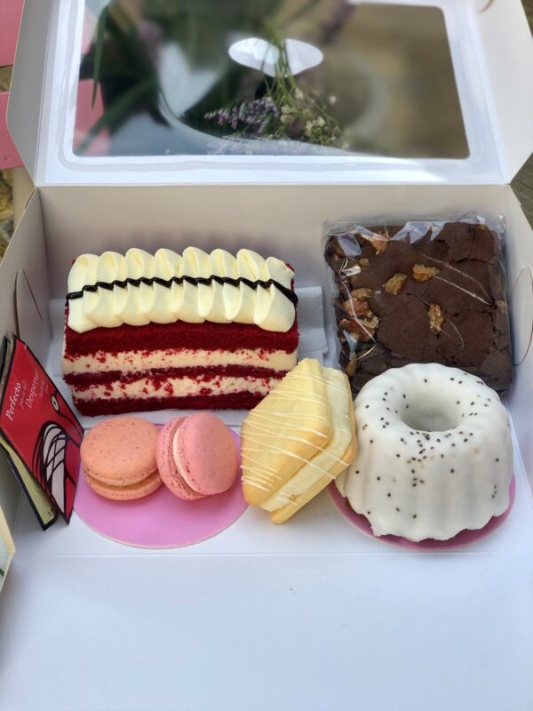 Red Velvet, Brownie con nuez , Budín Individual de limón, Alfajor de limón, 2 Macarons, 2 Saquitos de Té Twinings. Se presenta en Box kraft
